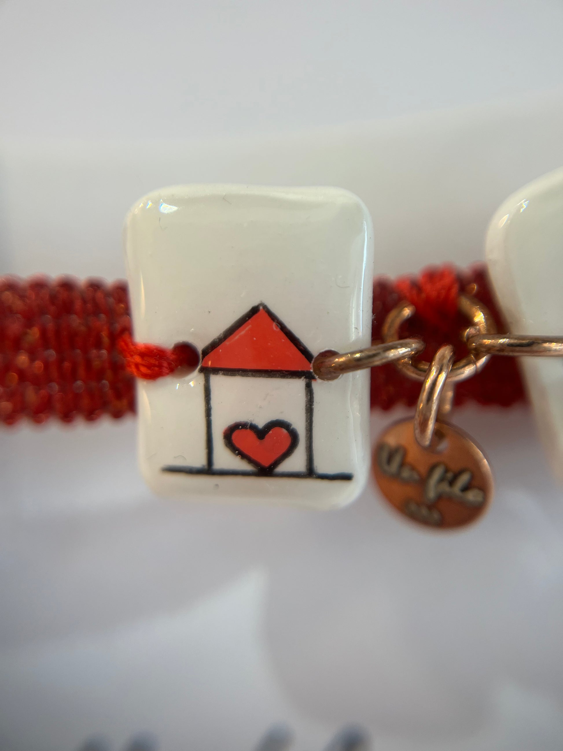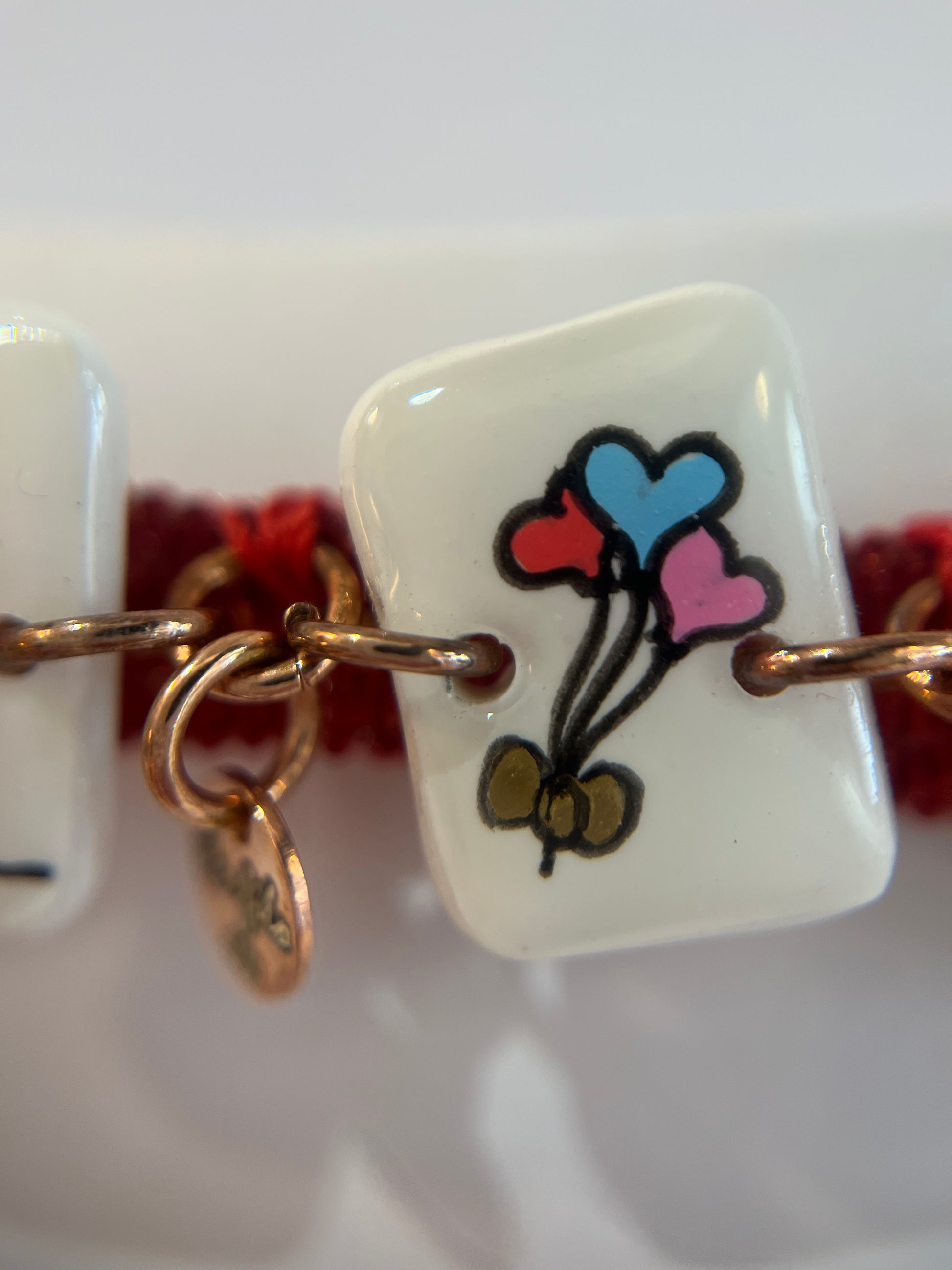 Il braccialetto è realizzato a mano con un filo rosso elastico e tre ciondoli in porcellana dipinta. Ogni pezzo è unico e nasce da un’attenta ricerca di materiali alternativi e originali.