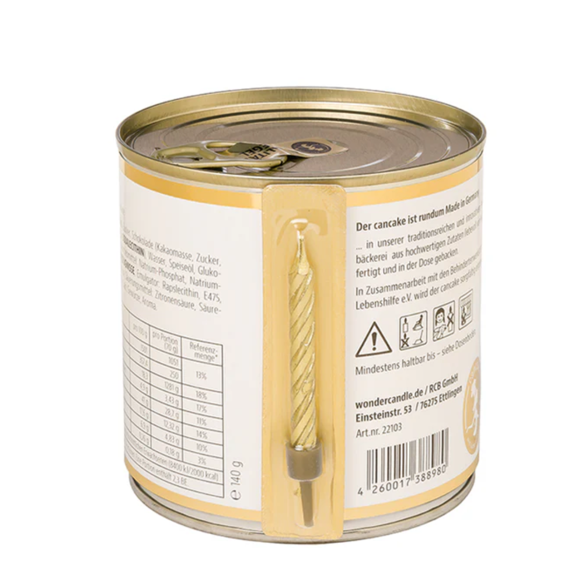 Un brownie morbido e ricco, cotto direttamente nella lattina e pronto da gustare in ogni occasione speciale. Il Cancake Brownie è una coccola dolce per chi ama i sapori intensi del cioccolato fondente. Nessuna preparazione richiesta: si apre, si accende la candelina e si festeggia! Il regalo perfetto per augurare buon compleanno con tanto di candelina dorata per il fatidico e tanto atteso "desiderio" di rito! Pronti ad intonare Happy Birthday to you?